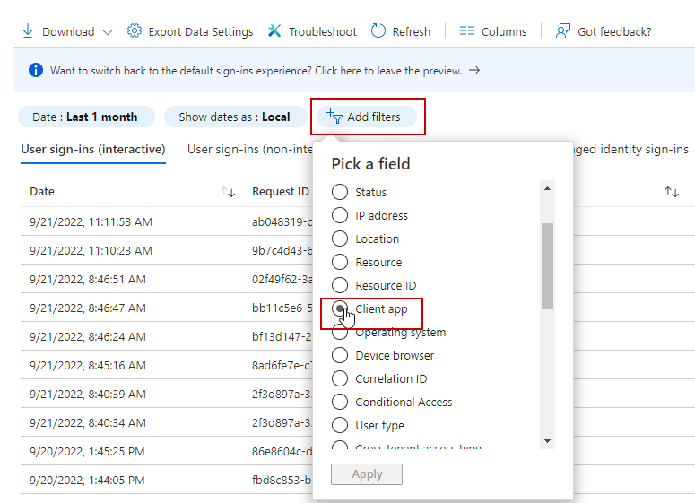 - Sign into portal.azure.com and navigate to Azure Active Directory. Select sign-in logs on the left pane under Monitoring. Change the date filter to be something greater than the last 24 hours. Add a filter. Choose Client App and click apply.