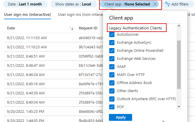 - After selecting Client App, the filter will show None Selected. Click the filter, and select all available options under Legacy Authentication Clients. Click Apply. Any basic/legacy authentications will show in the results. See screenshots below.