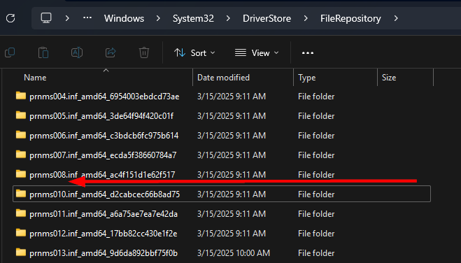 So, we first need to install the Microsoft Print to PDF driver on our system. This driver is located in C:\Windows\System32\DriverStore\FileRepository in a directory starting with prnms009. In the example below, we don’t see that directory; it skips from 008 to 010. This is an indication that the driver is missing or couldn’t be installed on the target system: