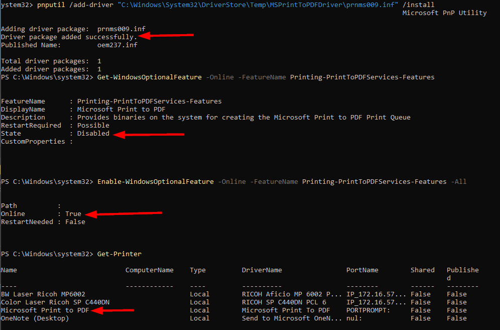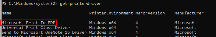It’s pretty simple to add this feature for some one-off issues; when it gets added, the Print To PDF driver is installed on the system. This can be verified using the get-printdriver command: