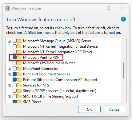 The Microsoft Print to PDF printer should be enabled by default on any Windows 11 PC. I don’t rely on this printer and don’t know many people who do, but it’s a nice bonus to have it available, and some users rely on it. If the print to PDF printer is not enabled, it’s usually simple to enable it from the Windows features: