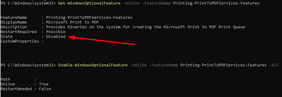 - Get-WindowsOptionalFeature -Online -FeatureName Printing-PrintToPDFServices-Features