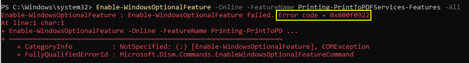 - Enable-WindowsOptionalFeature -Online -FeatureName Printing-PrintToPDFServices-Features -All