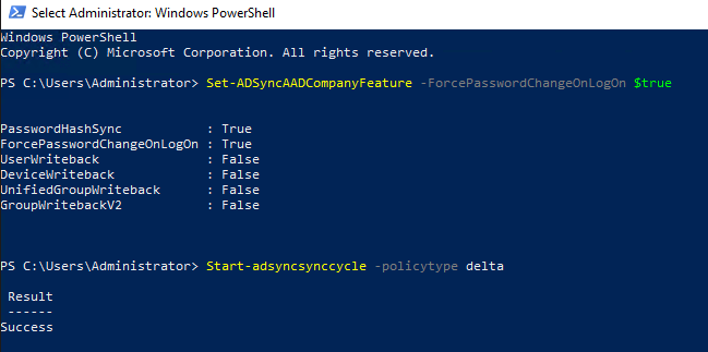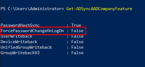 However, by default, AD connect doesn’t sync the change password at next login flag. So, that box will only end up applying to users with domain-joined or hybrid-joined devices with line-of-sight to a DC. We can see that Entra Connect won’t sync this setting by opening powershell and issuing the Get-ADSyncAADCompanyFeature command, and we will see ForcePasswordChangeOnLogOn is set to false: