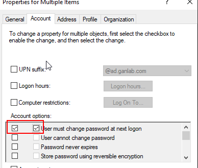 We’re probably all familiar with the account setting in AD to force a password change at next logon, which does exactly what it says. Note that if you have accounts set to never expire the password or where the user cannot change password, those will override this setting. Also, if you need to do this for multiple users, or even an entire OU, you can set this for an OU or by multi-selecting users:
