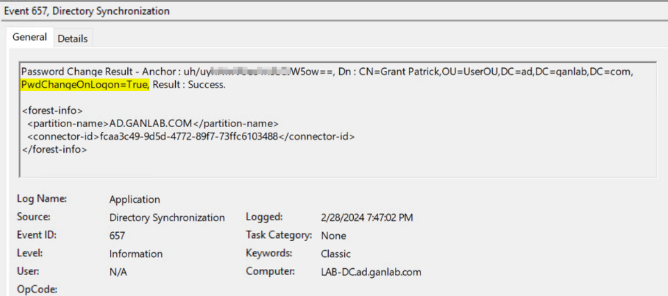 The event log is where you want to look. Specifically, the application event log. If all is working properly, when a user is required to change their password at next logon, the next delta sync will log Event ID 657 with the source of Directory Synchronization. It should show “PwdChangeOnLogon=True”
