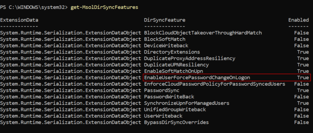 You’ll get results like this, and the value for EnableUserForcePasswordChangeOnLogon should be True.