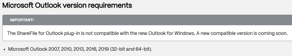 Since COM add-ins are not compatible with New Outlook, most vendors are phasing them out and replacing them with web add-ins. However, not all vendors have a replacement yet. For example, the Citrix ShareFile for Outlook add-in states that it is only compatible with Outlook Classic, but a new version is coming soon: