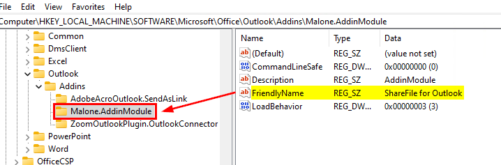 We want to enable blocking all unmanaged add-ins. This will block any add-ins not specifically listed in the List of Managed Add-ins setting. For the add-ins we want to allow, we will need to retrieve that name from the Registry. On a machine with the add-in installed, navigate to HKEY_LOCAL_MACHINE\SOFTWARE\Microsoft\Office\Outlook\Addins. A list of the add-ins will be under that key. Selecting each key will show you the name value of the add-in, and it won’t always match the parent key. For example, if we want to find the Citrix ShareFile add-in, we can see it’s actually named “Malone.AddinModule”
