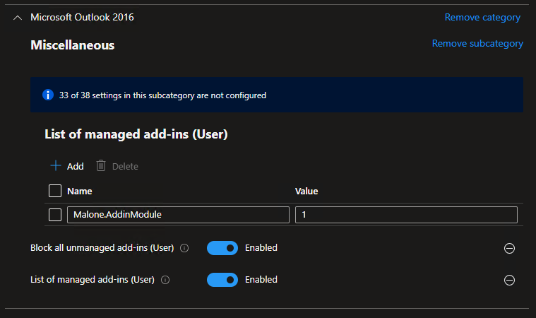 That wraps up managing COM Add-ins. I won’t go into detail for managing this with GPO since you should be pushing towards cloud-native endpoint management, but the equivalent settings for a GPO can be found under User Configuration > Policies > Administrative Templates > Microsoft Outlook 2016 > Miscellaneous > List of managed add-ins