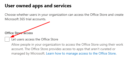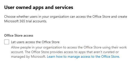 This is the easiest way to disable store access, but the downside is that it’s tenant-wide and applies to all users, regardless of other policies. There is a way to scope blocking access, but there are caveats, and it can get messy.