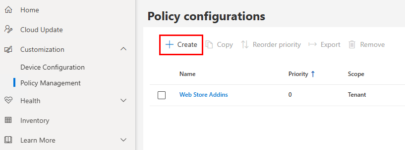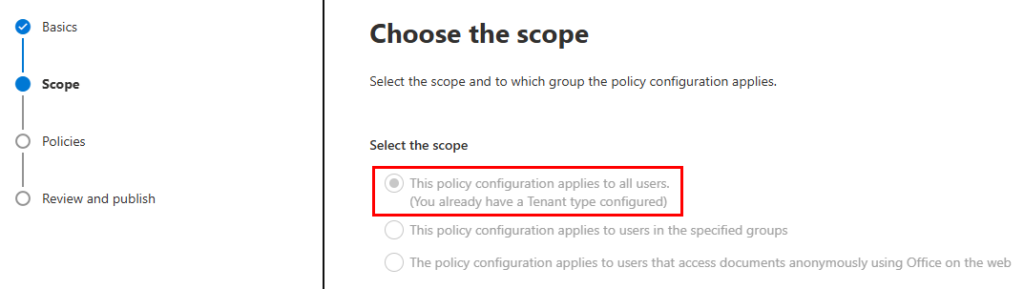 I don’t think using these policies for managing access to the store is worthwhile. However, if you wanted to simply block all web add-ins from running in your desktop or web apps, you can make a tenant-wide policy by navigating to Customization > Policy Management and clicking Create. Name the policy and then scope it to all users: