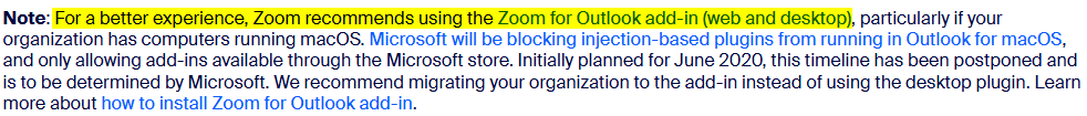 Other vendors, like Zoom, still support their Outlook COM add-in, but are pushing their users to move to the more modern web add-in: