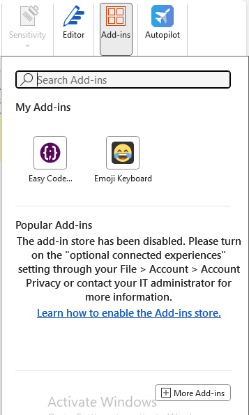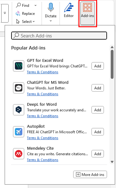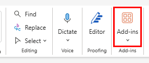 Web add-ins are the new way to add extra functionality to your M365 Applications. Unlike COM add-ins, web add-ins are installed from the add-in store within the M365 App, which is accessible from the app’s ribbon: