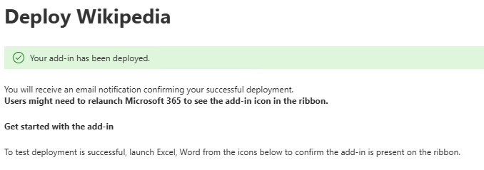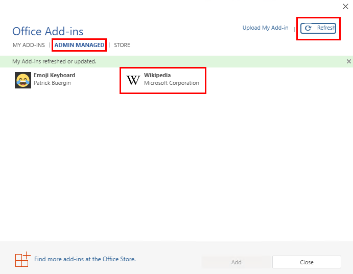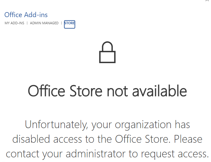 And if they try to access the store, they will receive a message that the add-in store has been disabled. This screenshot shows two apps under my-addins, which we will get to soon.