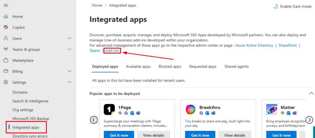 What about web add-ins you want the users to have? We can centrally manage our approved add-ins in the M365 admin center. For the older UI, from https://admin.microsoft.com, navigate to Settings > Integrated Apps, and select the Add-ins link at the top of the page: