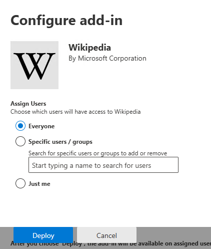 When you create a policy from the M365 Apps Admin center, it can be scoped tenant-wide or to specific users. Personally, I prefer to use Intune for this since that’s likely what you’ll be using to deploy the com add-ins, but this is another option