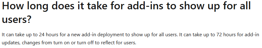Unless you’re in a highly restricted environment, you probably don’t want to blanket block all add-ins. So, my recommendation is to block the store from M365 admin center settings > org settings > user owned apps and services, and then centrally manage the add-ins from the admin center, which we will look at next. Also, when making these policy changes, whether it’s from the M365 admin center or the M365 Apps Admin center, they can take a LONG time before they hit your users. In my testing, it was almost always 24-36 hours for existing devices. Microsoft says it can take up to 72 hours.