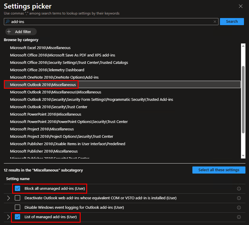 We won’t review how to deploy an MSI/EXE com add-in. We are assuming you already know how to do that. To manage which COM add-ins can and can’t be used, you want to make a settings catalog policy and add search for add-ins. You’ll see results for each of the M365 Desktop Applications. In this example, we will focus on Outlook, but you’ll want to add settings for each of the M365 Desktop Apps you want to control. The two settings I want to point out are: