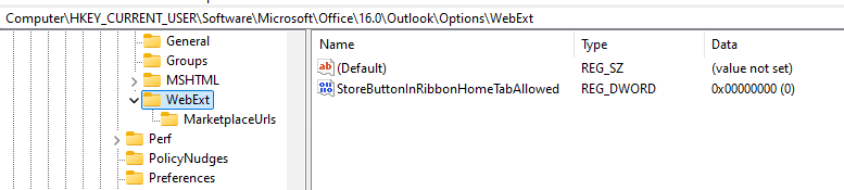 Another suggestion specific for Outlook Classic was to add the Registry DWORD StoreButtonInRibbonHomeTabAllowed set to 0, stored in HKCU\Software\Microsoft\Office\16.0\Outlook\Options\WebExt. Again, this did nothing.