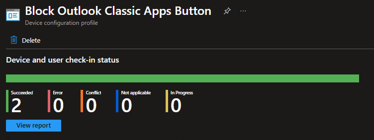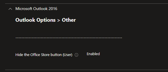 Another suggestion for Outlook Classic was to disable the store button using the settings catalog in Intune. This showed applied, but again, it still allowed full access to the store button.