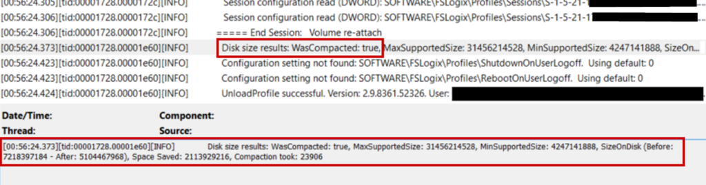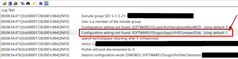 The registry value for this feature is HKLM:\Software\FSLogix\Apps\VHDCompactDisk. A Value of 1 is enabled, and a value of 0 disables this feature. You’ll notice this registry value does not exist after updating to this FSLogix version, but compaction will still occur since it’s the default behavior. We can see in our FSLogix profile log (C:\ProgramData\FSLogix\Logs\Profile) that without that registry value, it uses the default of “1”, which is enabled. In the event you want to disable this feature across numerous hosts, you can use Group Policy and set the property under Computer Configuration > Policies > Administrative Templates > Disk Compaction.