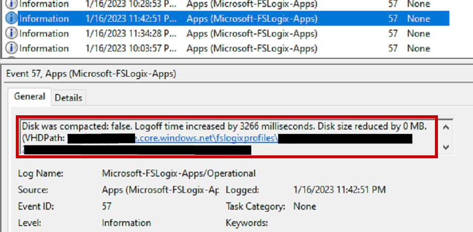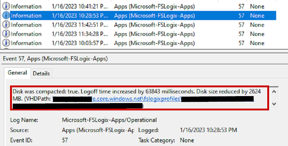 After some users have signed in and out of your AVD environment, you can verify if their profile was compacted using the FSLogix logs or the event viewer. Let’s look at the FSLogix log first. An easy way to find the log entries is searching for “WasCompacted: True” or “WasCompacted: False”. This shows some additional details on the size of the disk, the space saved, and how long compaction took. If you have never ran compaction on your profiles before, users will likely see a long sign-out the first time after this FSLogix version is installed. The compaction process takes some time and depending on size of VHDX and may take a couple minutes.