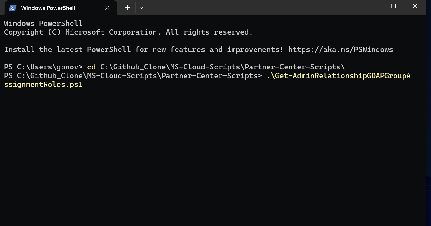 That’s the manual way to check. But, if you have tens or hundreds of clients to look at, this will take forever. Luckily, there is a PowerShell module to help with this – Microsoft.Graph.Identity.Partner Module | Microsoft Learn. This module has some cmdlets that allow you to look at your partner center customers, view admin relationships, and view the permissions assigned to the security groups. For my use, I wanted an export for each customer, the security groups with roles assigned, and which roles were assigned to those security groups. What I came up with is a script that does the following: