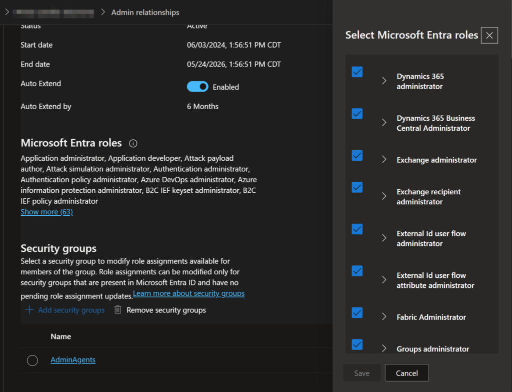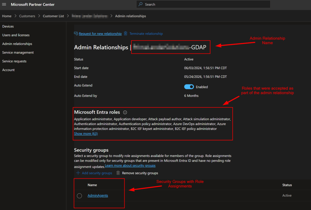 Partner Center is sometimes misunderstood and since this is not a very well-known area for some organizations, it can get messy, or have far more permissions assigned to some users than you want. You can see the role-assigned groups for an admin relationship under Partner Center > Customers > Select Customer > Admin Relationships. Here you can see the Name of the admin relationship, the roles that were accepted for the relationship by the client, and the security groups that have roles assigned: