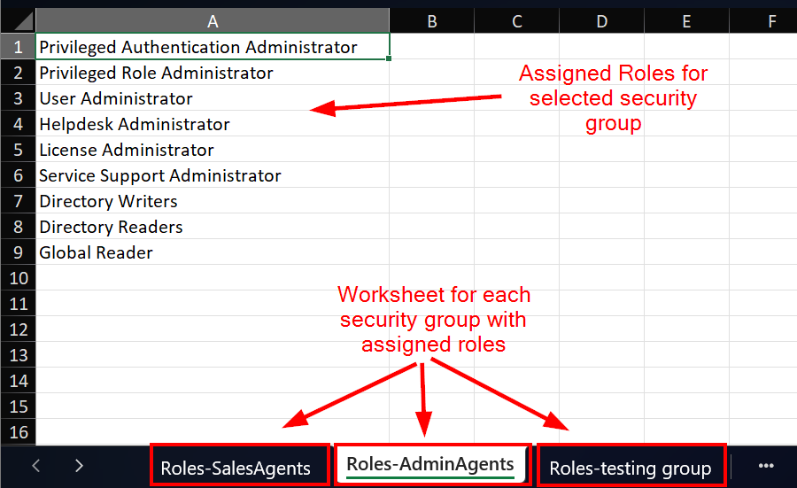 - Each security group will have a worksheet tab with the name of the security group and the role assignments in the spreadsheet.