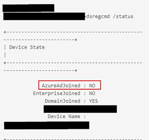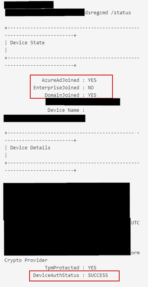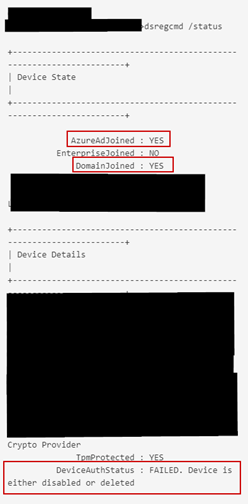 If we check the join status of the device with dsregcmd /status we can see now the device auth shows SUCCESS, and the device is properly HAADJ in AzureAD.
