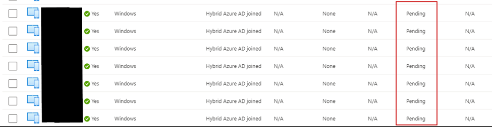 As the remote devices started returning to the office to get line-of-sight to a DC so they could be properly hybrid joined, I had an issue with several devices being stuck in a pending registration state in Azure AD. Deleting and allowing them to rejoin resulted in the same device state. Windows was on the latest build, and there was no proxy or firewall blocking anything.