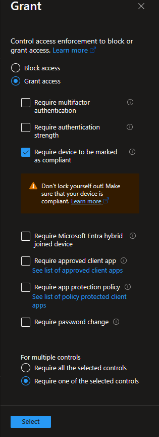 On the opposite end of the spectrum, we can simply block any unmanaged device from accessing corporate resources. This is the most strict and secure method. Unless the device is enrolled in Intune, access to your cloud apps is blocked. Users will need to use a corporate Intune-managed device for access. If all your employees are issued a company-owned device, you’ll want to strongly consider blocking access from personally owned devices. The conditional access policy to only allow access from compliant devices is rather simple: