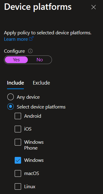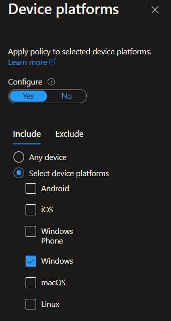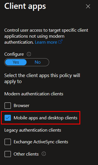 For the Conditions, select Windows as the targeted device platform and for Client Apps, select Mobile apps and desktop clients