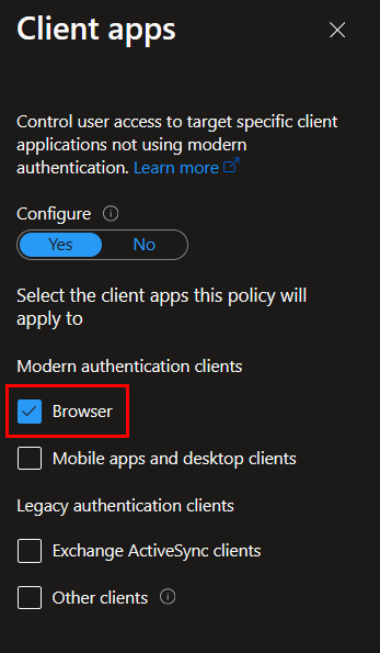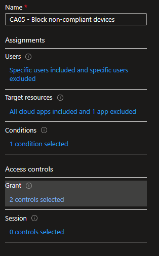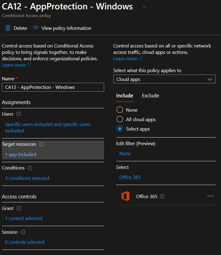 Now that we have our App configuration policy created, we need to create two conditional access policies – One that will block the use of the desktop apps on non-compliant (unmanaged) devices and another that requires an app protection policy for unmanaged devices when signing in using a browser.
