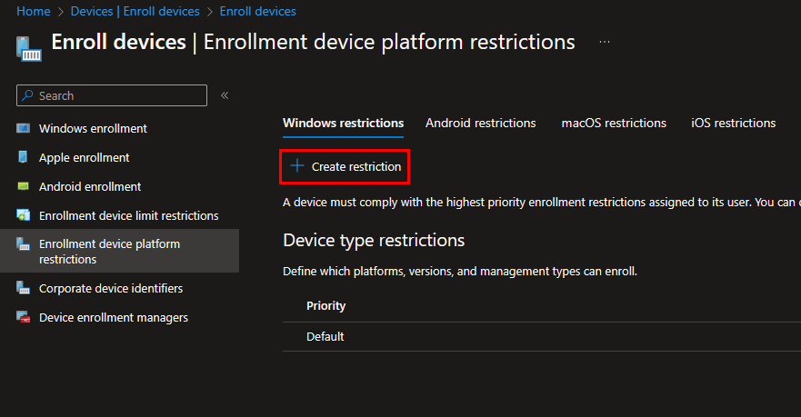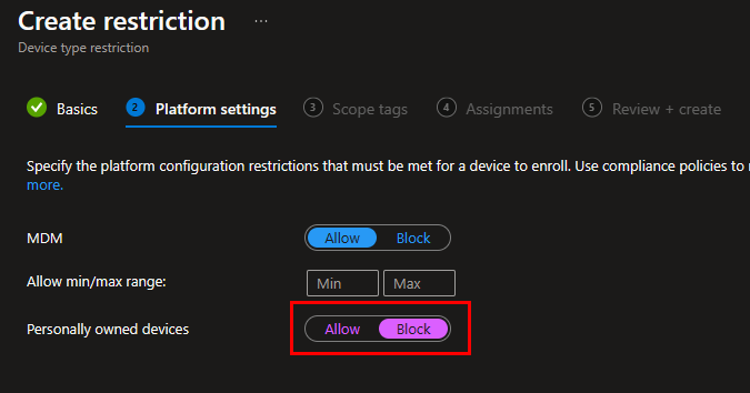 Before we move on to more testing, you probably don’t want users enrolling personally owned devices in Intune. It’s good practice to block this using enrollment device platform restrictions. In most cases, users mistakenly enroll their devices without knowing what they did. Creating a restriction, like the two screenshots below, will prevent them from mistakenly enrolling a device in Intune: