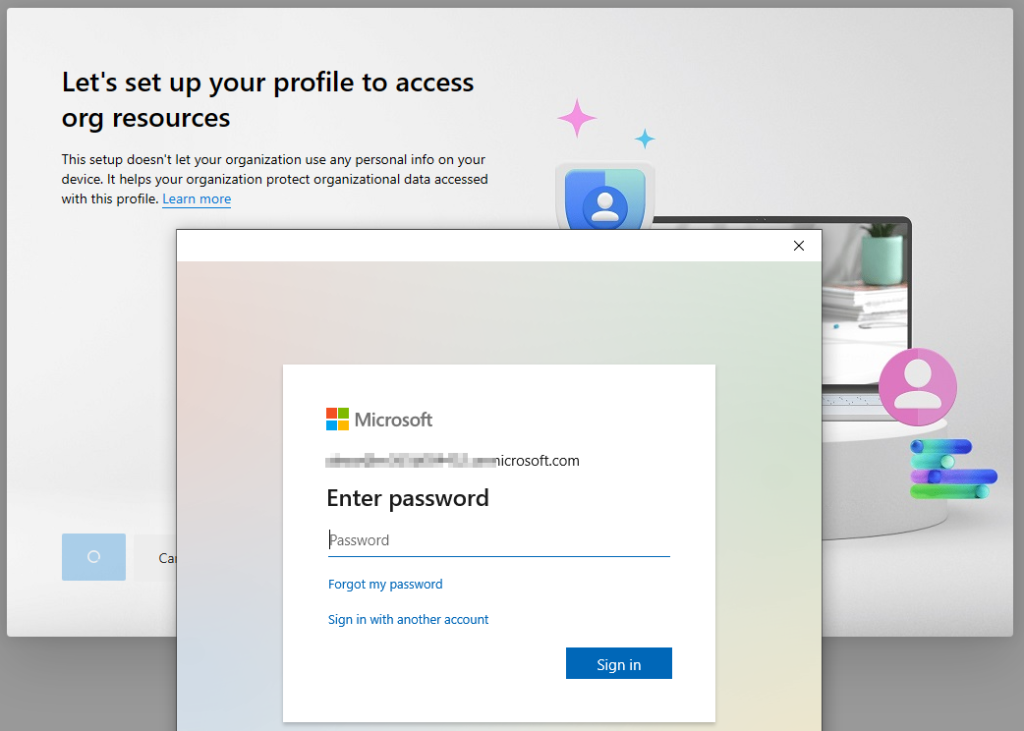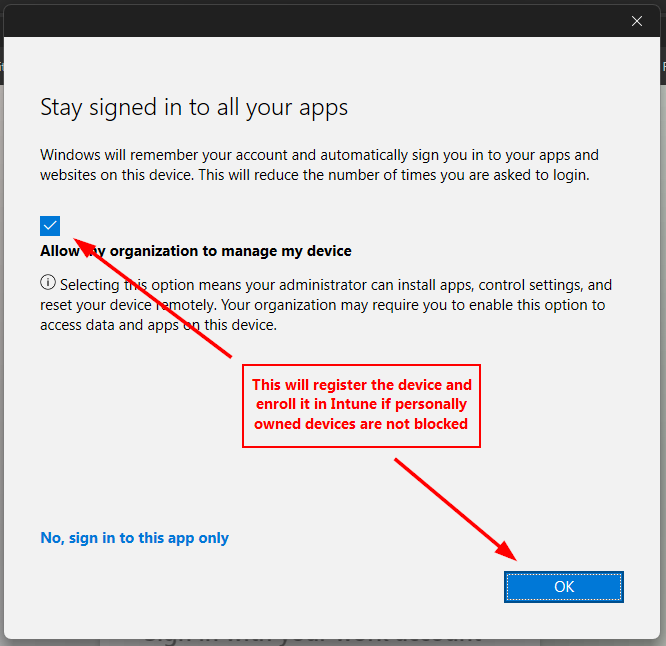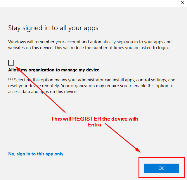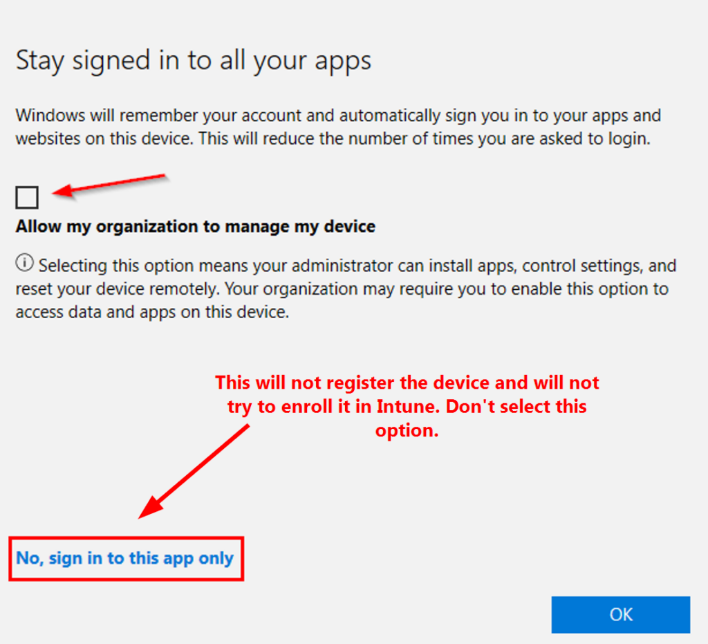 Before we move on, let’s quickly talk about the below screenshots. When you click continue in the above screenshot, you’ll be presented with the below window. It’s important to know what will happen based on what you select. Device registration is a requirement for conditional access, so we need to register the device, but we don’t want to enroll it with Intune. When you receive the prompt, you want to uncheck the box to Allow my organization to manage my device and then click OK. See the descriptions in the screenshots below: