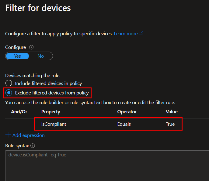 Under Conditions, we need to configure device platforms, client app, and device filters. Select Windows as the device platform, browser as the client app, and filter to exclude compliant devices from this policy: