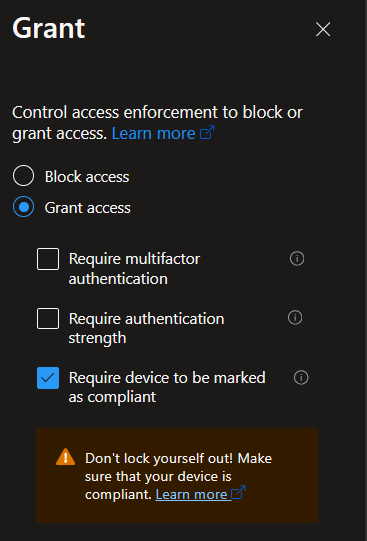 This will block any non-compliant managed device from accessing your selected cloud apps.