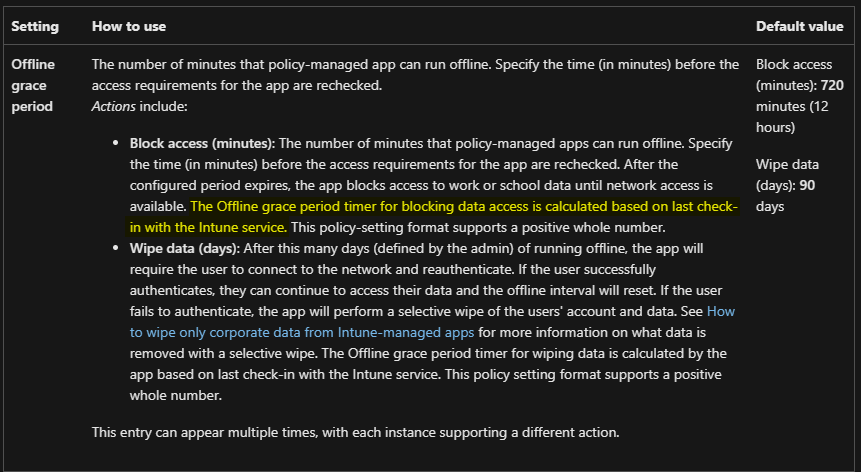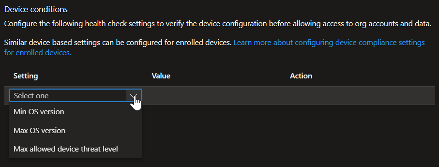 The Health checks section is comprised of app and device conditions for the unmanaged endpoints. These are also mostly self-explanatory. I should note that the default Offline Grace Period is only 12 hours, which will result in the user being blocked the very next day (unless they keep the work profile opened and active on their device). So I’ve changed the value to 10080 (7 days). We’re also able to set Minimum Versions for Edge and Windows so we aren’t allowing old unsupported versions access to our resources.