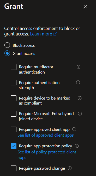 Next, under the grant controls, select to require an app protection policy. Enable the policy when you’re finished.