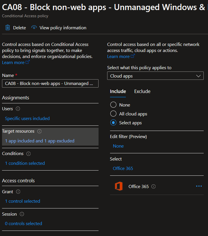 We’ll walk through creating our first policy below, which blocks the use of desktop clients. Create a new conditional access policy, provide a name, and select your users (probably all users). In the target resources section, select Cloud Apps and Office 365.