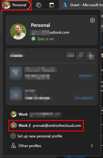 Looking back at our MAM device, after the device is registered, the work profile creation will be completed and the app protection policy will be enforced on the work profile. You can see your edge profiles by clicking in the top left of Edge. We can see the newly added work profile here: