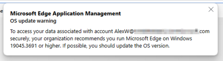 If we set a minimum OS version with a warning in our app protection policy, this is what the warning will look like for the user. You can configure multiple rules, so you can add a warning for versions that are approaching the end of servicing, and block anything that is at the end of servicing.