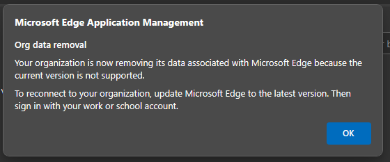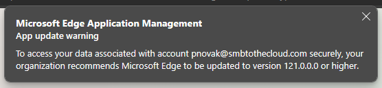 If we specify a minimum edge version with a warning, and the user is below the specified version, they’ll receive the below warning message: