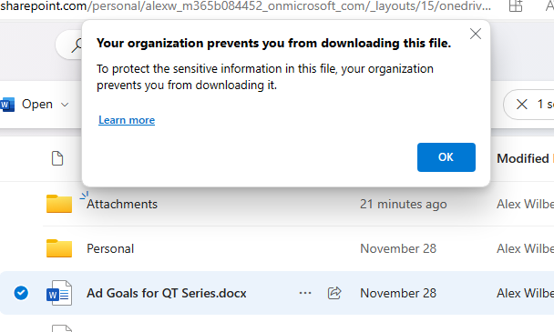 If we try uploading a file to OneDrive or SharePoint via the upload button or by dragging it into the browser: