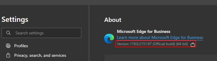 We can do the same for the version of MS Edge. You can find a list of the Edge Versions here – Microsoft Edge release notes for Stable Channel | Microsoft Learn . You can find the version on a specific machine from the ellipses menu > Help and Feedback > About Microsoft Edge