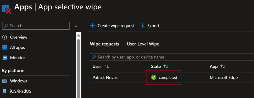 In testing, this all happened in less than a minute. If we navigate back to the App selective wipe portion of Intune, we can see the wipe request is marked as completed: