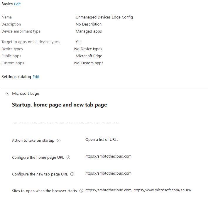 In addition to the app protection policies, you can use App Configuration Policies to target certain configurations for Edge in the work profile. Here’s an example where you can set the home page and tabs you want open when the work profile starts: