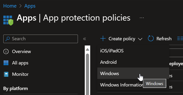 To create an app protection policy for Windows, open Intune and navigate to Apps > App Protection Policies. Click create policy, and then choose Windows: